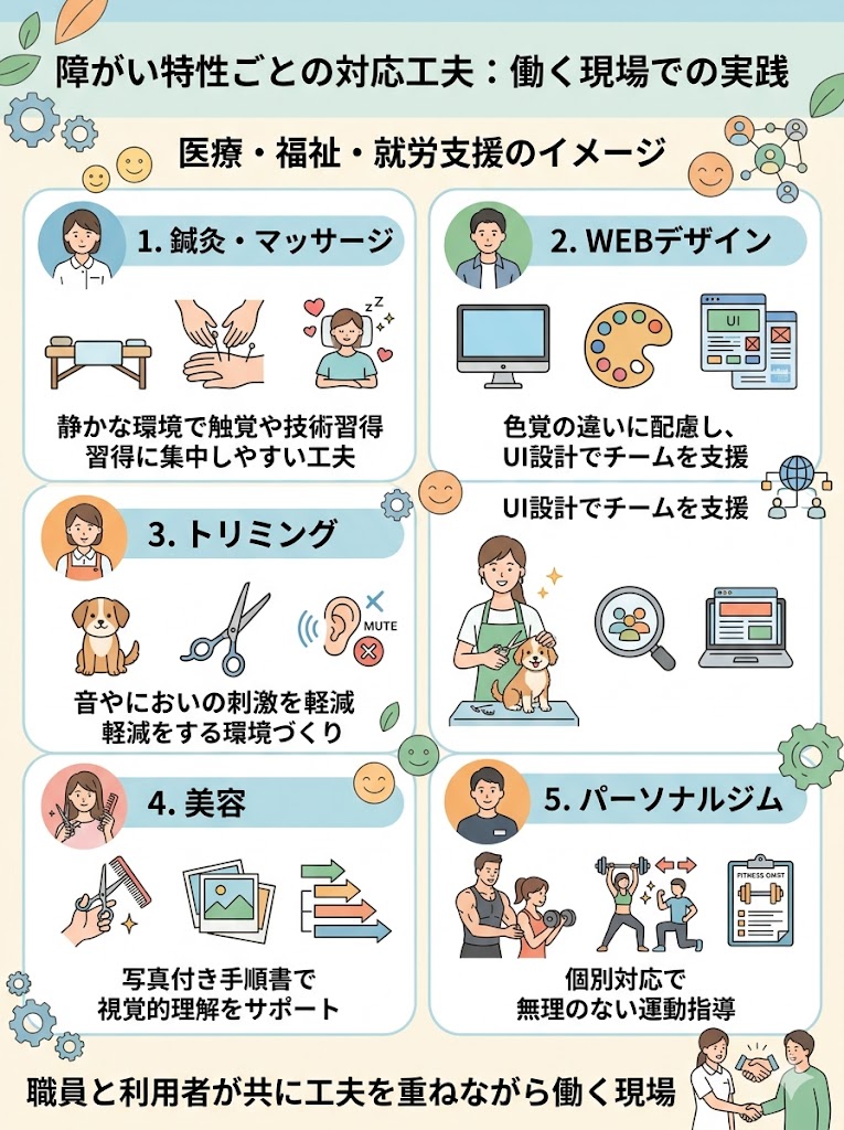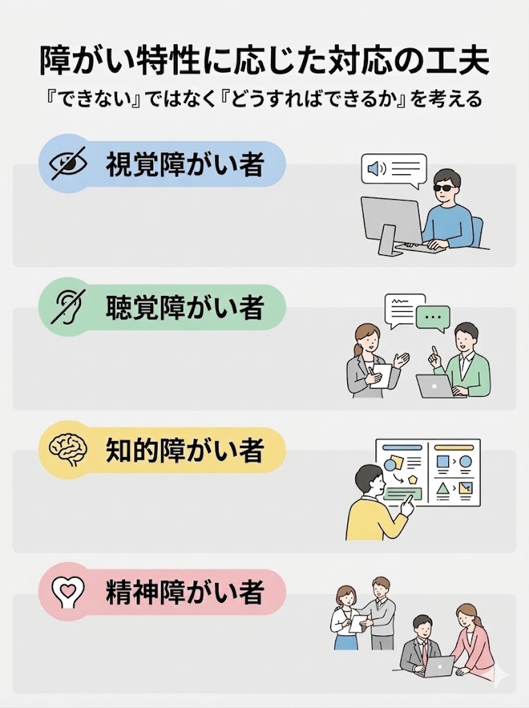 この記事では、視覚・聴覚・知的・精神など多様な障がい特性に応じた工夫と、「やり方を変える支援」の実例を通じて、誰もが安心して働ける職場づくりのヒントをご紹介します。